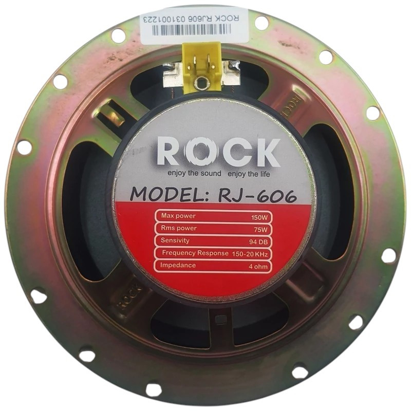 مشخصات فنی بلندگو فابریک خودرو راک مدل RG 606 مناسب پژو: سایز این بلندگو 6 اینچ می باشد. توان اسمی(RMS) بلندگو 75 وات و حداکثر توان خروجی آن 150 وات می باشد. امپدانس بلندگو 4 اهم می باشد. این بلندگو دارای حساسیت 94 دیسیبل و واکنش فرکانسی ۱۵۰ هرتز تا ۲۰,۰۰۰ هرتز می باشد.
