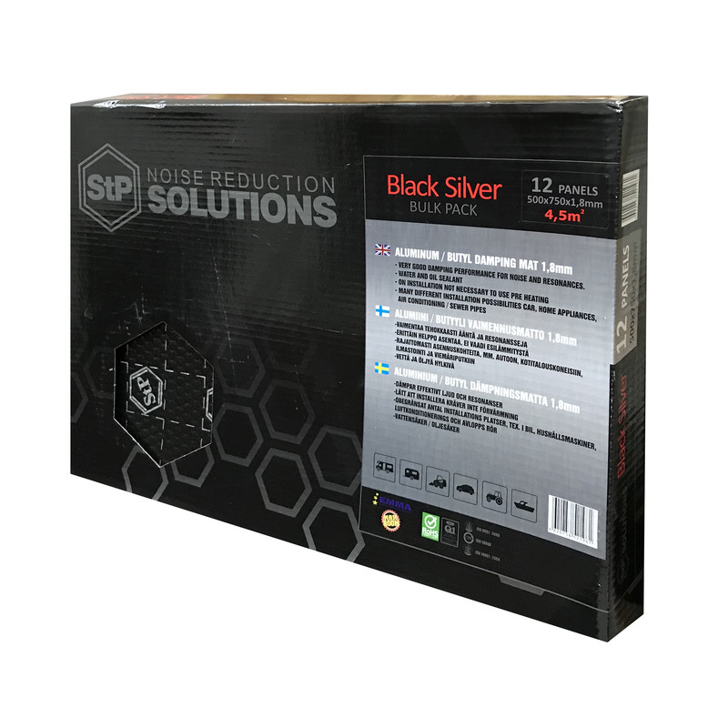 برای کسب بالاترین لذت شنیدن موسیقی در خودرو، باید عواملی که مانع این کار هستند را با نصب ورق دمپینگ از بین برد تا اتاق خودرو به فضایی آکوستیک و موسیقی پذیر تبدیل بشود. نصب ورق دمپینگ بر بدنه داخلی خودرو، از موثرترین روشهای دفع صداهای خارج از خودرو است که در عین حال که موجب دفع نویز و ارتعاشات بدنه خودرو می شود، در جلوگیری از ورود حرارت ایجاد شده در بدنه بیرونی خودرو به داخل کابین نیز موثر است و با ایجاد فضایی آکوستیک موجب بهبود کیفیت موسیقی در حال پخش می شود. ورق دمپینگ خودرو برند STP مدل Black Silver توسط شرکت STANDARTPLAST در کشور روسیه ساخته می شود که این شرکت از سال 1996 بصورت تخصصی در این زمینه فعالیت می کند که در حال حاضر از متخصص ترین تولید کنندگان این محصولات در دنیا است، زیرا برای قسمت های مختلف بدنه داخلی خودرو و کاربردهای خاصی مانند ایجاد عایق صوتی، ارتعاشی و حرارتی، محصولات متنوعی را بطور همزمان تولید می کند. مواد مورد استفاده در ساخت این نوع ورق دمپینگ خودرو از نوعی پلیمر به نام بوتیل است که ضریب جذب ارتعاش و نویز خیلی خوبی دارد. فاقد بو و مواد مضر برای سلامتی است. به دلیل خود چسب بودن و ضخامت بسیار کم 1.8 میلی متر ، نصب آن بسیار آسان است و با آموزشی بسیار مختصر، خودتان نیز می توانید به نصب آن بر بدنه داخلی خودرو اقدام کنید. مواد مورد استفاده در ساخت ورق دمپینگ در مقابل حرارت بالا آنقدر مقاوم است که هیچوقت شعله ور نمی شود. ابعاد هر ورق 50 در 75 سانتی است و هر پک (بسته) حاوی 12 ورق است که مجموعا مساحتی معادل 4.2 متر مربع را پوشش می دهند. این نوع ورق دمپینگ خودرو بر قسمت های مختلف بدنه داخلی خودرو از قبیل درب ها، سقف، گلگیرها، صندوق، کاپوت و سطوح فلزی دیگر قابل استفاده است.