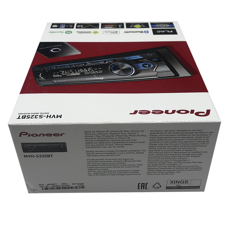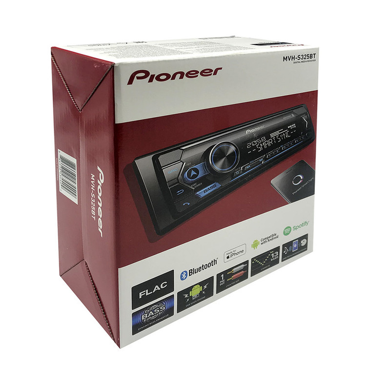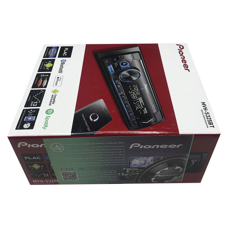 پخشکنندهی خودروی « MVH-S325BT» از محصولات کمپانی «پایونیر» (Pioneer) است. این محصول با امکانات و ویژگیهای جالبی طراحی شده است. MVH-S325BT به یک عدد پورت USB مجهز است که از طریق آن میتوانید فلشمموری خود را به آن متصل کرده و از فایلهای دلخواهتان در خودرو استفاده کنید. برای راحتی کاربران، این پورت در قسمت جلویی بدنه تعبیه شده است؛ همچنین در صورتی که مایل باشید فایلهای موجود در MP3 Player خود را از ضبط خودرو بشنوید، میتوانید با استفاده از پورت AUX این مدل، پخشکنندهی موسیقی تان را به آن متصل کنید. گفتنی است که سیستمعامل سازگار با این دستگاه، اندروید و iOS هستند که میتوانید با اتصال تلفن همراه از طریق کابل، بلوتوث و اپلیکیشن پایونیر فایلهای صوتی موجود در آن را به پخش بگذارید. فرمتهای صوتی MP3 / WMA / AAC / WAV / FLAC در این مدل پشتیبانی میشوند تا کاربران بهراحتی از فایلهای موردنظر خود استفاده کنند. بیشینه توان خروجی این دستگاه 4 × 50 وات بوده و کیفیت آن 16 بیتی است. برای پخش فایلها از این دستگاه میتوانید از فلشمموری یا گوشی خود استفاده کنید. در جعبهی این محصول، ریموت کنترل، میکروفون و کابل رابط وجود دارند گفتنی است این محصول از سازگار با استاندارد 2006 CEA پشتیبانی میکند و میتوانید از Spotify برای پخش در آن استفاده کنید. هم چنین، می توانید با استفاده از این دستگاه مکالمات خود را مدیریت کنید و از دستیار صوتی Siri و یا GOOGLE ASSISTANT استفاده نمایید. قابلیت MIXTRAX نیز برای اتصال مستقیم به سابوفر نیز برای این محصول در نظر گرفته شده است.